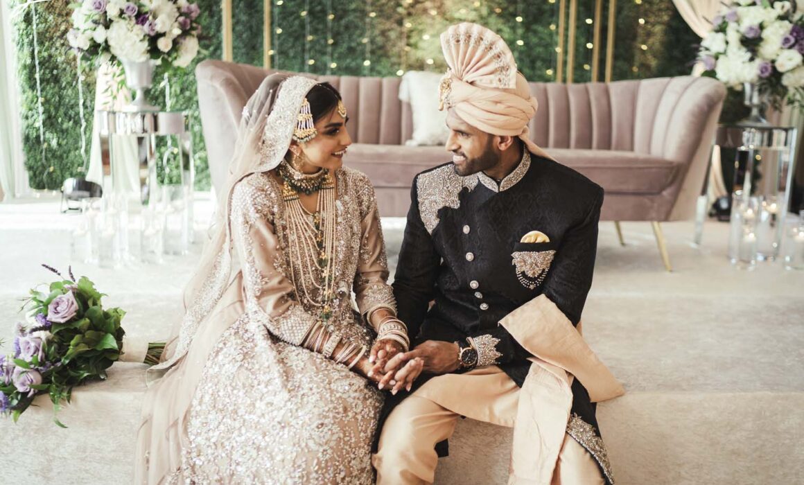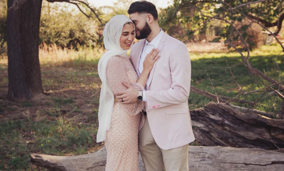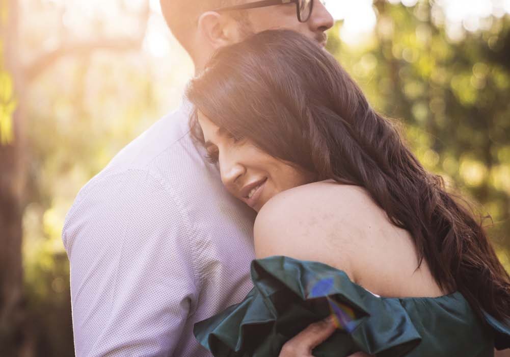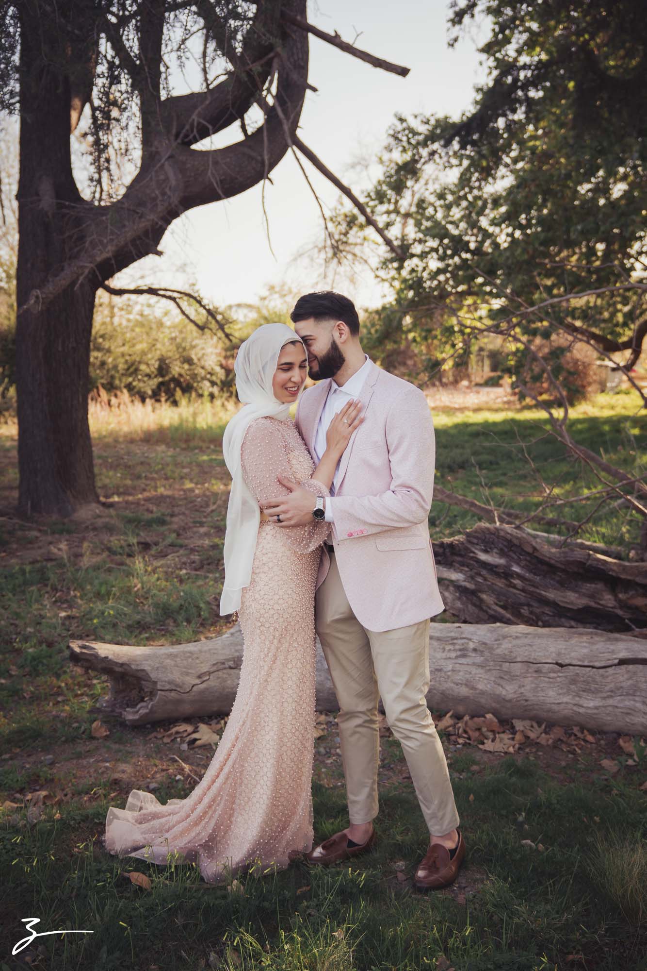 Love among beautiful scenery. Sunset. Trees. Bride + Groom.